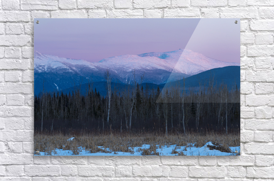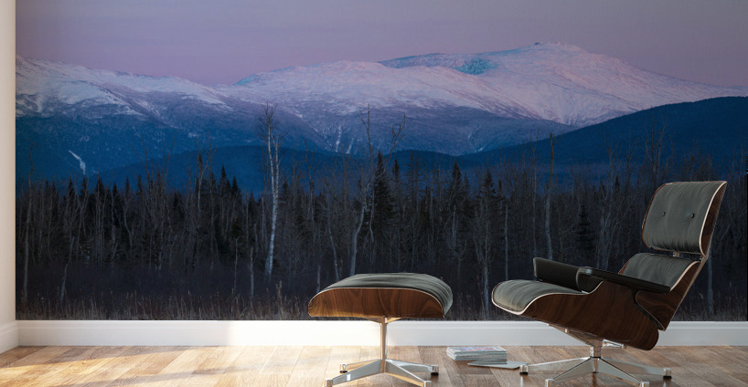 Pondicherry Wildlife Refuge - Scenic view of the Presidential Range covered in snow from along the Presidential Range Rail Trail a segment of the Cohos Trail near Cherry Pond in Jefferson New Hampshire just after sunset.