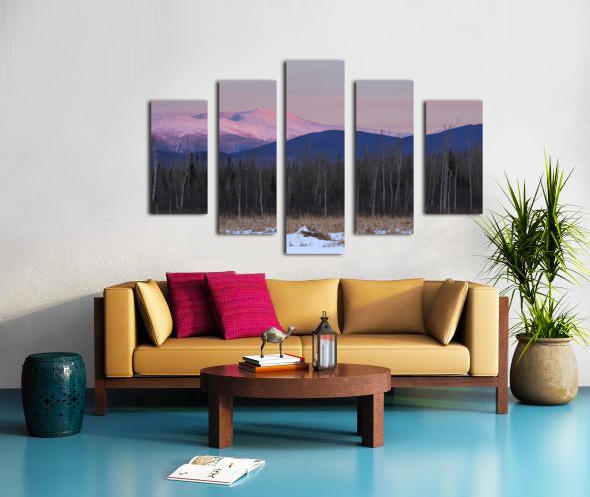 View of Mount Washington covered in snow at sunset from along the Presidential Range Rail Trail Cohos Trail at Pondicherry Wildlife Refuge in Jefferson New Hampshire.