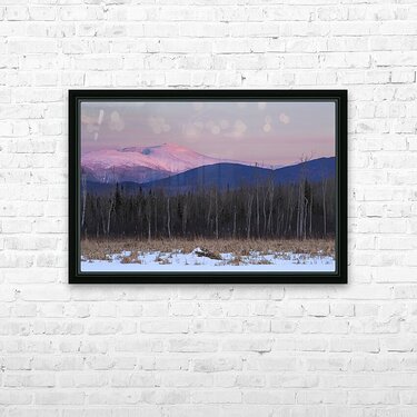 View of Mount Washington covered in snow at sunset from along the Presidential Range Rail Trail Cohos Trail at Pondicherry Wildlife Refuge in Jefferso...[+]