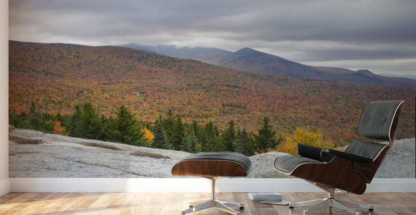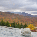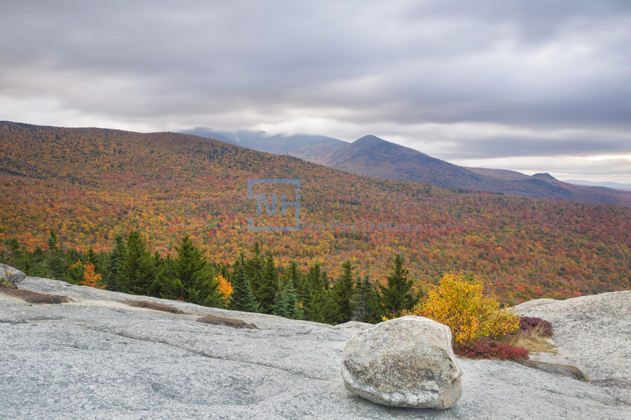 Autumn foliage on a cloudy day from Middle Sugarloaf Mountain in Bethlehem New Hampshire during the autumn months.
