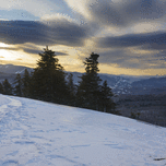 Scenic view from the summit of Mount Pemigewasset in Lincoln New Hampshire on a cloudy winter morning. A few of the ski trails on Loon Mountain can be seen off in the distance on the left.