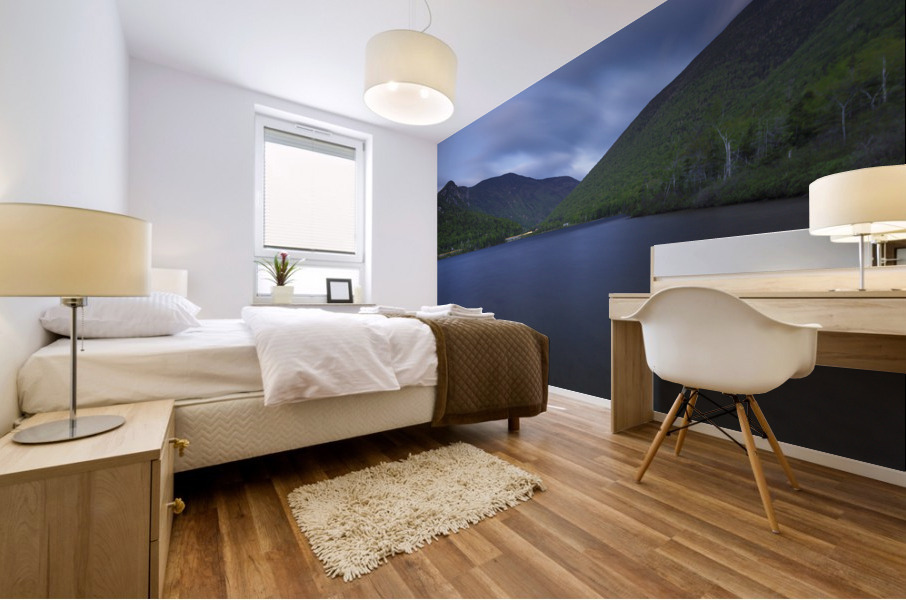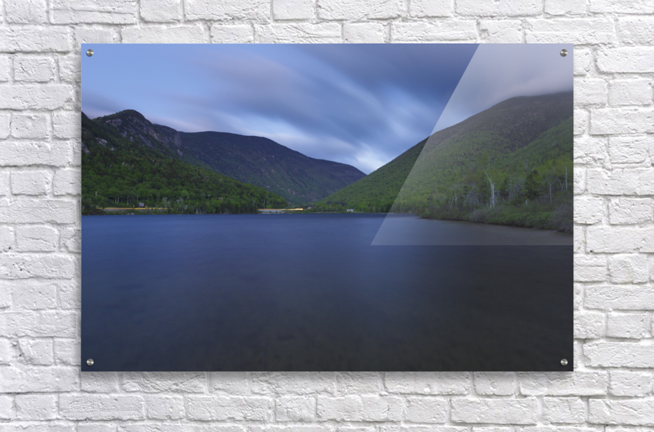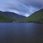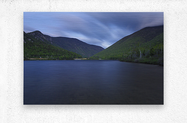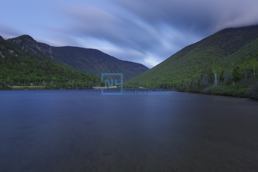 Echo Lake in Franconia Notch State Park in the New Hampshire White Mountains on a cloudy spring evening after sunset during twilight.