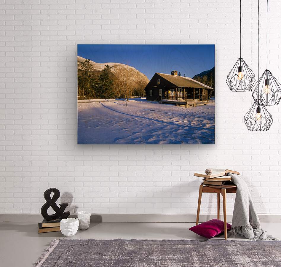 Scenic view from Lafayette Place in Franconia Notch New Hampshire during the winter months. Cannon Mountain is in the background. The Franconia Notch Bike Path travels pass this cabin.