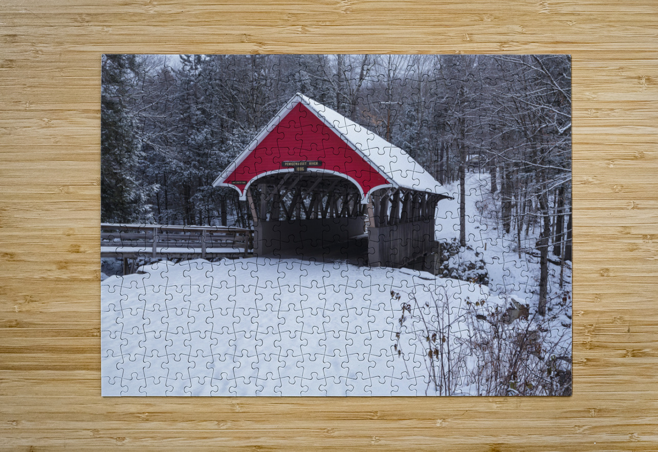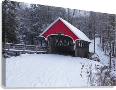 The Flume Covered Bridge in Franconia Notch State Park in Lincoln New Hampshire covered in snow on a winter morning. This picturesque bridge crosses the Pemigewasset River.