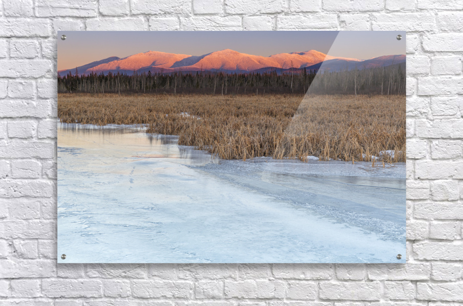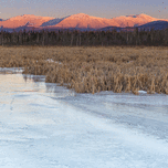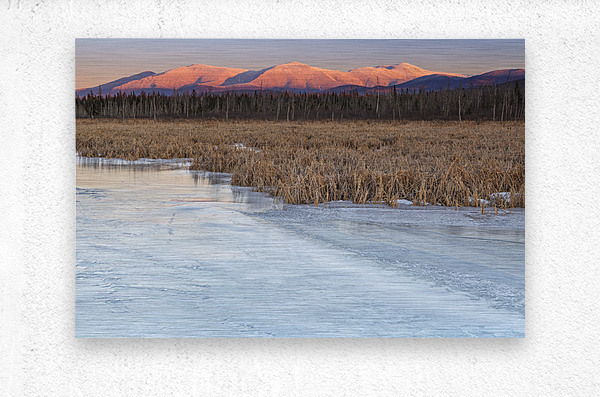 Snowcapped Presidential Range at sunset from along the Presidential Range Rail Trail Cohos Trail at Pondicherry Wildlife Refuge in Jefferson New Hamps...[+]