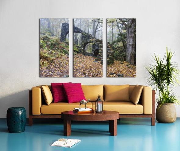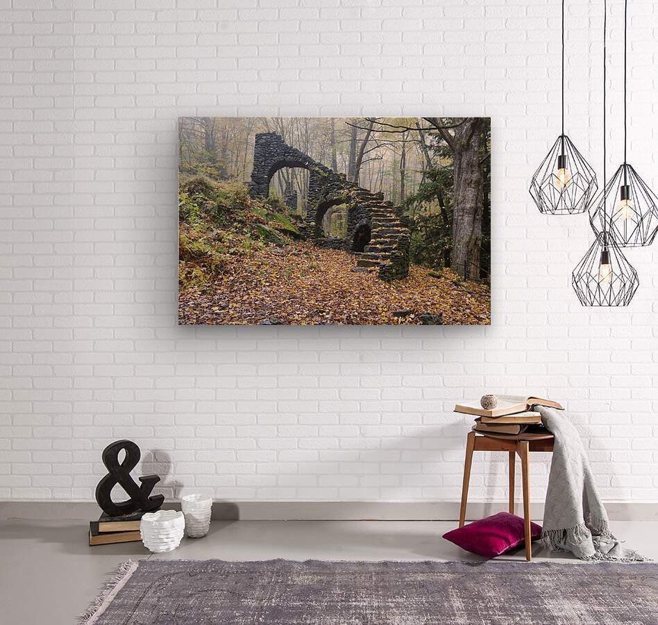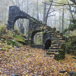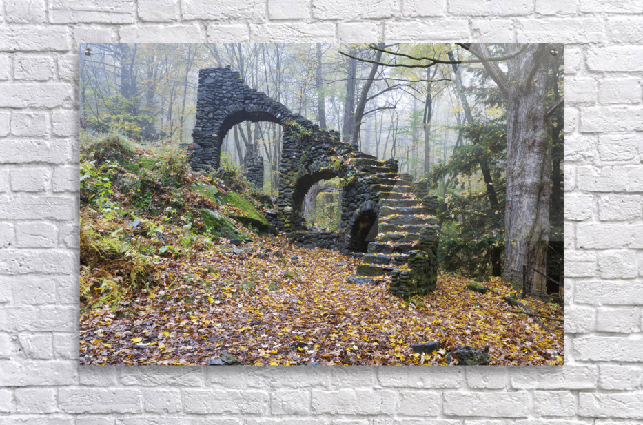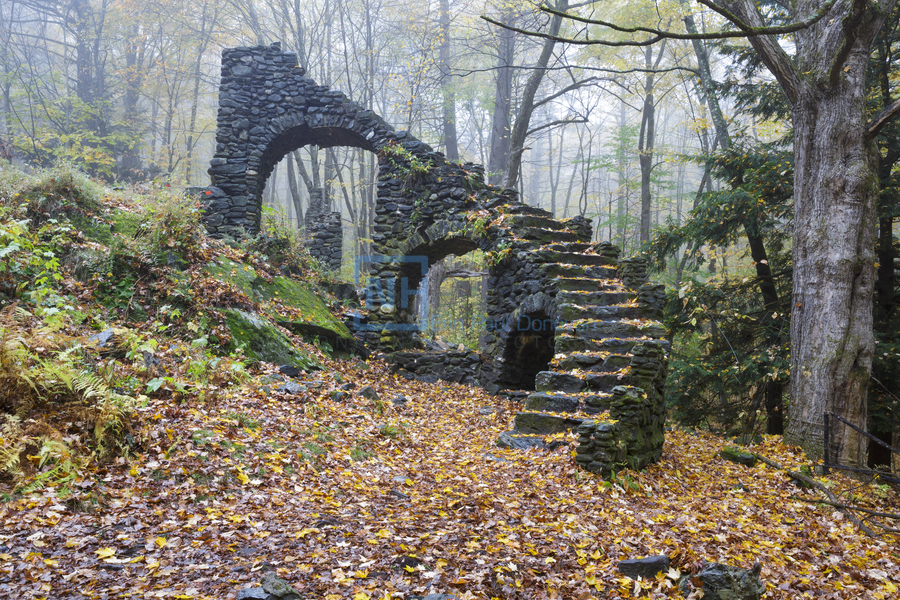 The ruins of Madame Antoinette Sherri’s castle in Madame Sherri Forest of Chesterfield New Hampshire during the autumn months. Madame Antoinette Sherri was a 1920s costume designer from New York who was known for throwing parties for visitors from the city. The castle was destroyed by fire on October 18 1962. The foundation and a stone staircase are all that remains.