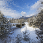 Bridge which crosses the East Branch of the Pemigewasset River along the Kancamagus Scenic Byway Route 112 in Lincoln New Hampshire on a cloudy and cold winter morning. Potash Knob is in the background. During the East Branch & Lincoln Railroad era trestle No. 4 which marked the start of the Hancock Branch of the railroad crossed the river in this location.