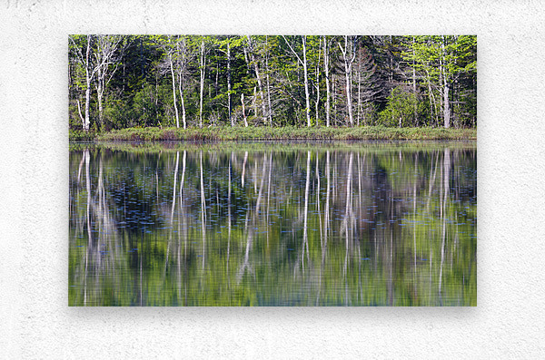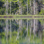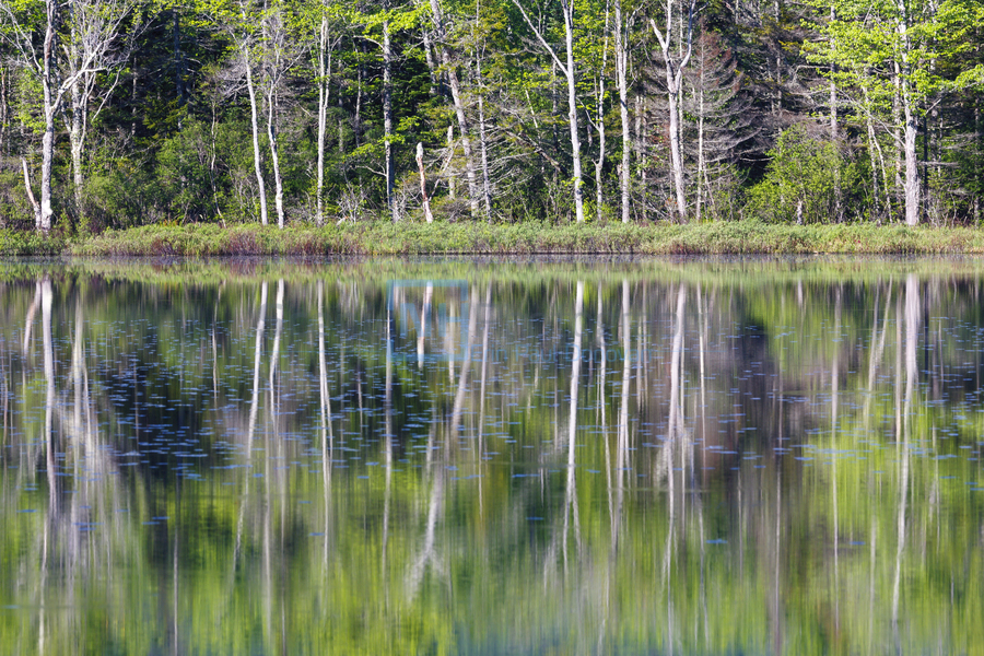 Reflection of forest in Elbow Pond in North Woodstock New Hampshire during the spring months. Species of fish in Elbow Pond include chain pickerel yel...[+]
