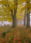 Greenlawn Cemetery in Mount Vernon New Hampshire on a foggy summer morning.