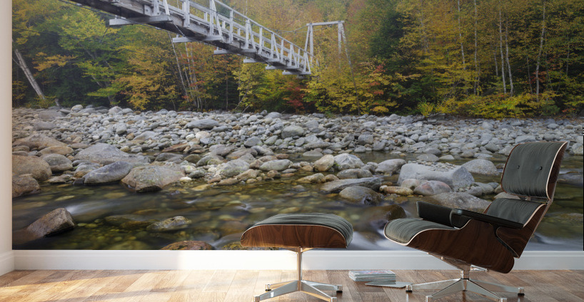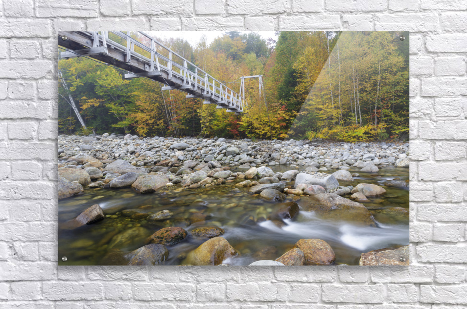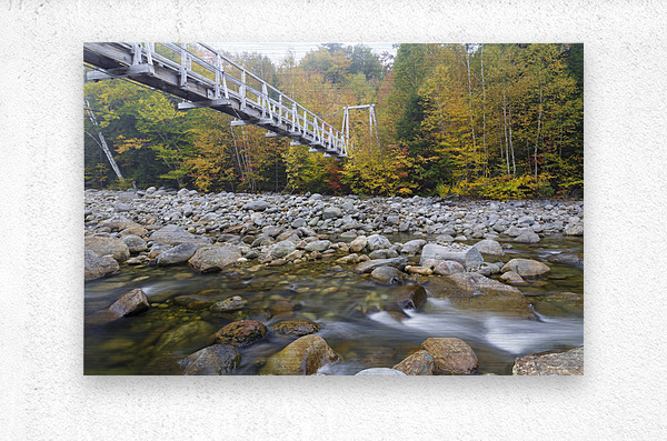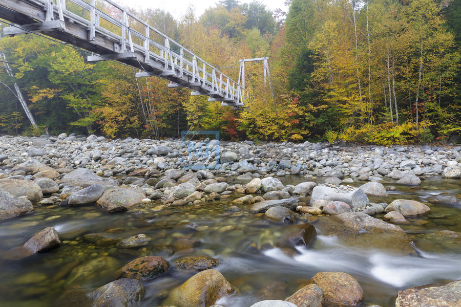 Foot bridge which crosses the Peabody River at the start of the Great Gulf Trail in Green’s Grant of the New Hampshire White Mountains on a foggy autumn morning.