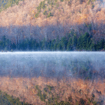 Upper Hall Pond in Sandwich New Hampshire on a foggy morning. This is a secluded pond located off of Sandwich Notch Road.