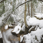Franconia Notch State Park - The Pemigewasset River near the The Basin viewing area in Lincoln New Hampshire covered in snow during the autumn months.