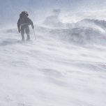 A winter hiker ascending the Air Line Trail in extreme weather conditions in the White Mountains New Hampshire during the winter months.