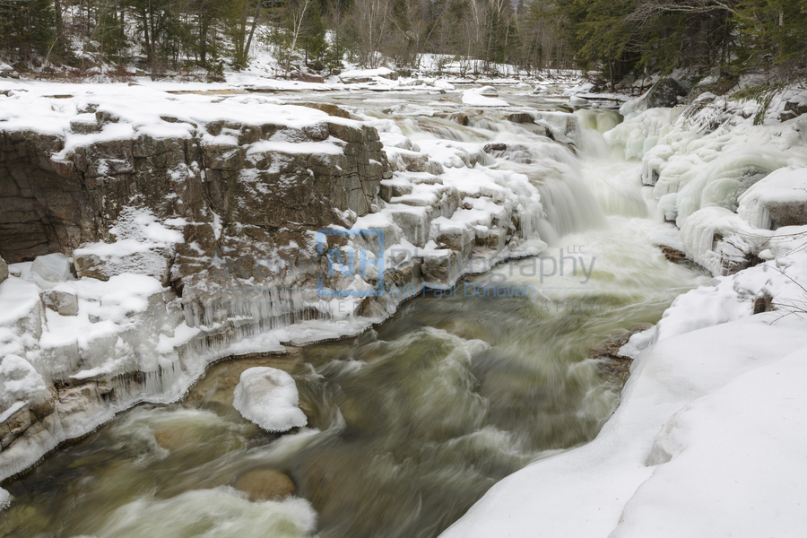Iced over cascades at Rocky Gorge Scenic Area along the Swift River in Albany New Hampshire during the winter months. Designated a scenic area in 1961 the Rocky Gorge Scenic Area is a 70-acre tract of land along the Kancamagus Highway.