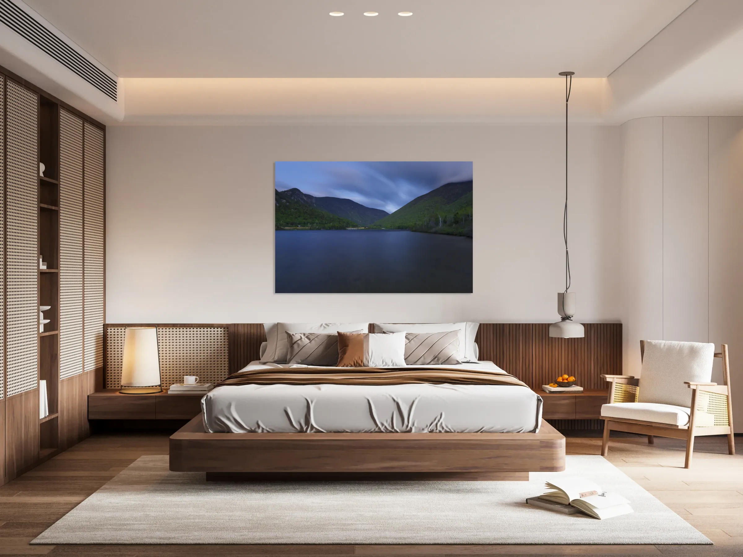 Echo Lake in Franconia Notch State Park in the New Hampshire White Mountains on a cloudy spring evening after sunset during twilight.