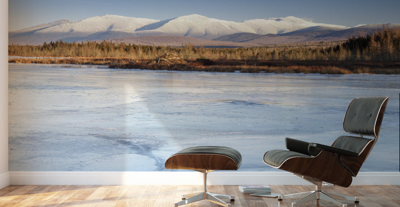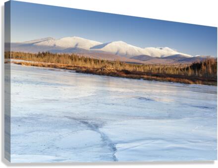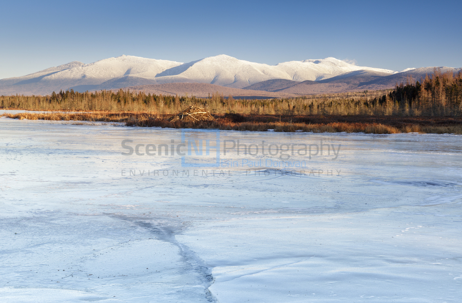 Snowcapped Presidential Range from Cherry Pond at Pondicherry Wildlife Refuge in Jefferson New Hampshire USA. The Presidential Range Rail Trail Cohos ...[+]