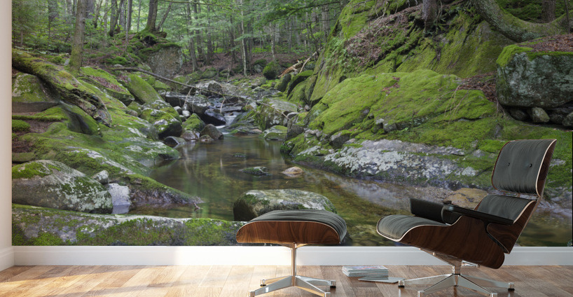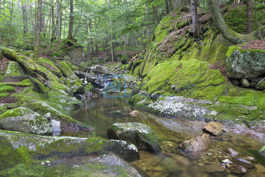 A small gorge area covered in moss along Walker Brook in Woodstock New Hampshire during the summer months.